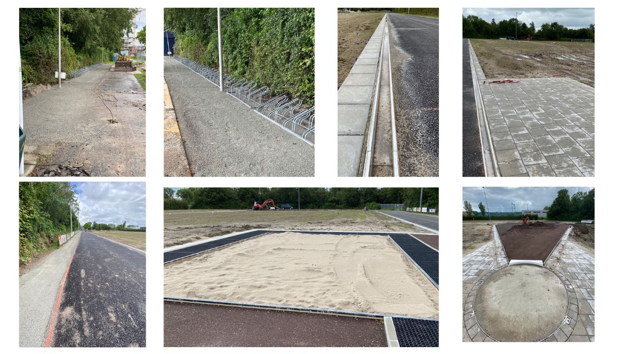 Wat is er de afgelopen week zoal gedaan? Wel, er komt een mooi pad langs de baan voor publiek, de fietsenstalling is aangepakt, rond de baan is een nieuwe aluminium afvoergoot aangebracht en de verspringbak is voorzien van mooi fijn zand.
